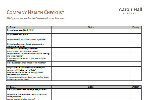 This checklist helps business owners spot issues affecting business health and growth. Attorney Aaron Hall developed it for his clients. It is freely available to help others avoid common legal problems that can weaken or destroy a business.