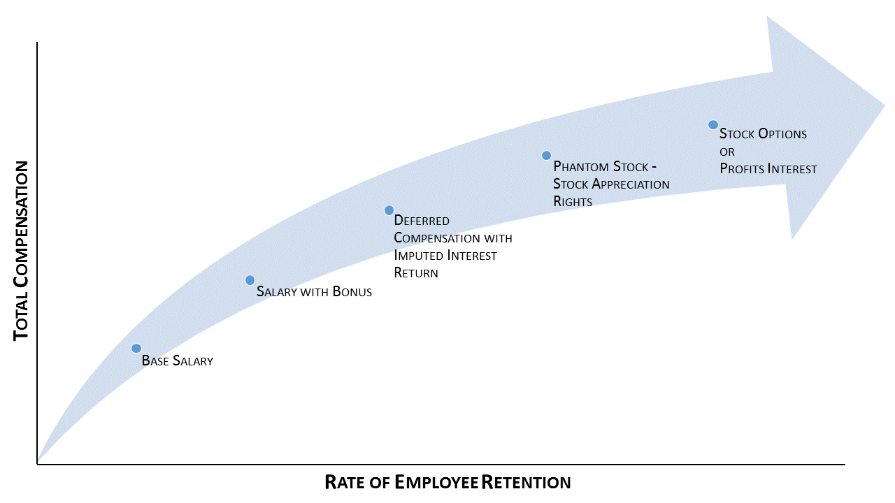 In a dynamic economy with rapidly developing technological advancements, companies often struggle to keep their key employees from moving to new opportunities. Retention of these employees must involve some type of equity participation. Base salary, and even a salary with bonus opportunities, just doesn’t cut it in hyper-competitive business sectors. Companies must be willing to share profits with key employees to retain them over the long-haul and to minimize attrition costs.