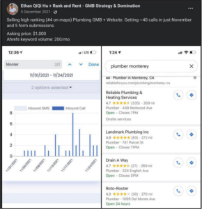 - In addition to selling these fake listings to GMBEye’s clients, Defendants sell them to other parties by other means. For example, Mr. Hu posted the below offer to sell a Business Listing in a Facebook group called “Rank and Rent – GMB Strategy & Domination,” claiming that his listing for a “Plumbing GMB + Website” in Monterey, California, had received “~40 calls and 5 form submissions” in the prior month, presumably from residents of the Monterey area who were seeking assistance with a plumbing issue.