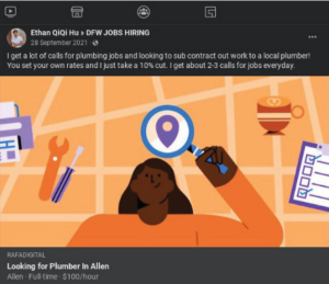 Defendants make no secret of this scheme. In addition to proudly offering “lead generation” services through Rafadigital, Defendants have solicited businesses through other channels. For example, Mr. Hu authored the below post in a Facebook group for people seeking work in the Dallas-Fort Worth area, claiming to “get a lot of calls for plumbing jobs” and offering to “sub contract” that work to a “local plumber” in exchange for “a 10% cut”: