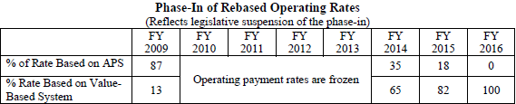 group and 105 percent of the peer group median for other operating costs. Rebasing for operating cost payment rates began October 1, 2008, and was designed to be phased in over eight years, through the rate year beginning October 1, 2015. During the phase-in period, nursing facilities were to receive a blended rate, based partially on the APS reimbursement system and partially on the new value-based reimbursement system. Also during the phase-in period, facilities were to be held harmless, a facility could not receive an operating cost payment rate that was less than what the facility would have received without rebasing. Property rates will be rebased beginning October 1, 2014.