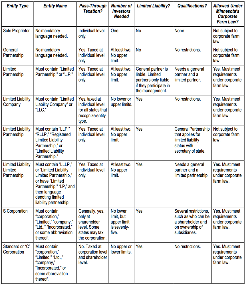 A form of business authorized by statute in Minnesota in 1993, an LLC combines the limited liability of a corporation and the pass-through taxation of a partnership. It’s as simple to create as a corporation. Unlike corporate shareholders, its owners can participate in the management of the company. An LLC can have an unlimited amount of owners and can be as small as a single individual. There are no restrictions on who can be an owner of an LLC, and all owners have limited liability.